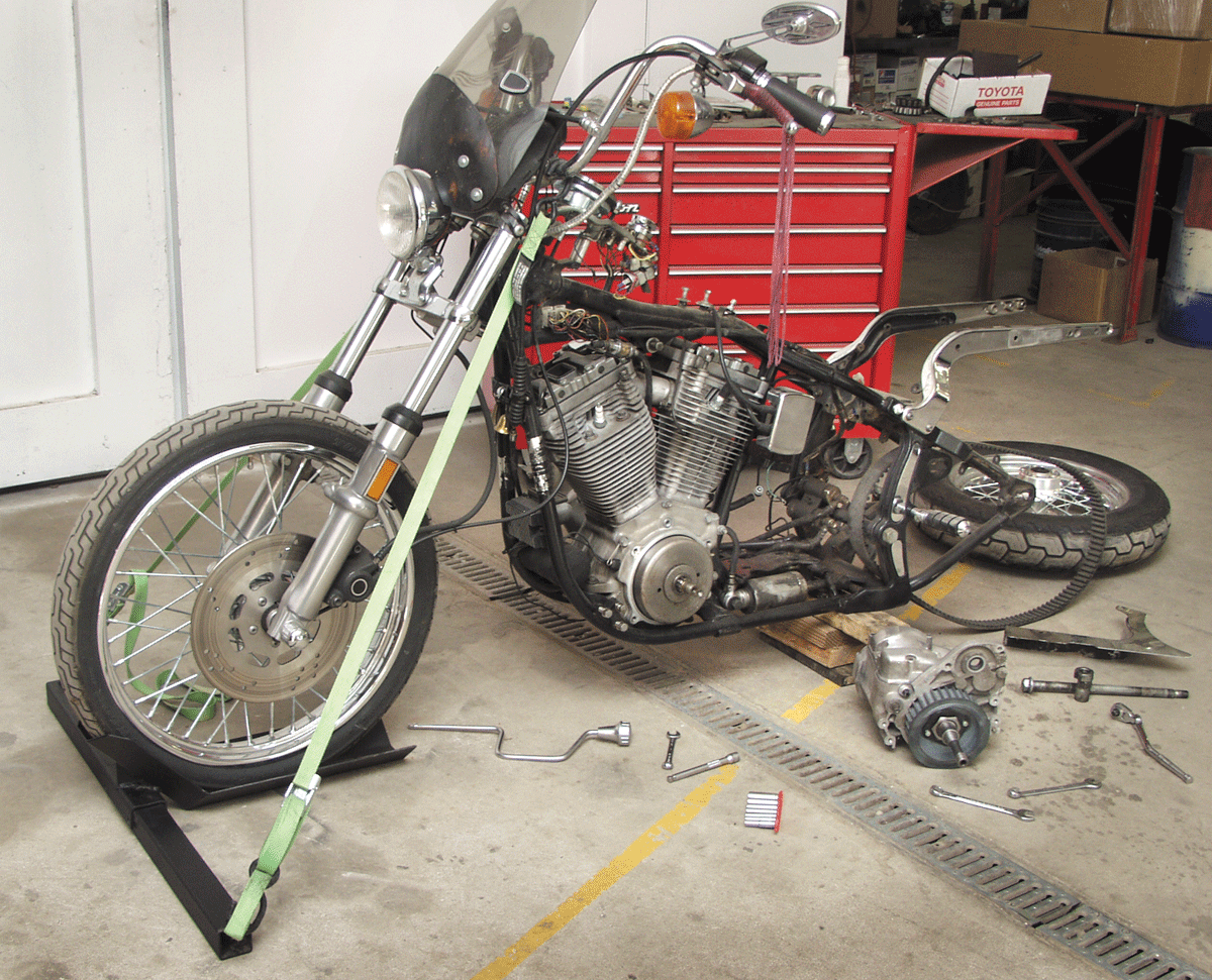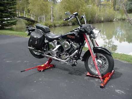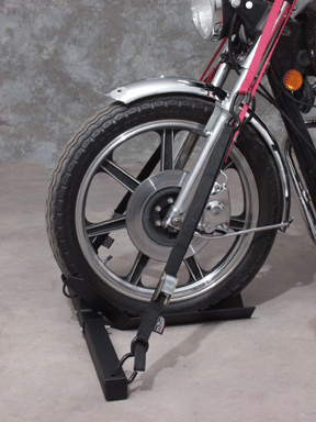 The Slik Stand makes a great work tool!! Use it to hold your bike upright and stable for simple maintenance or major repairs. Attach either wheel of your bike to the Slik Stand and the end of the motorcycle not attached can be raised as needed by jacking or any other safe means of lifting. This allows for removal of the front or rear wheels, forks, motor or any part of the bike. Use it in the garage, the driveway, or anywhere else that you want to stabilize your bike.